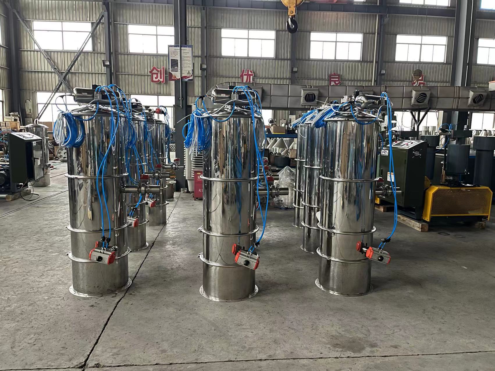 SF系列氣動式真空粉末上料機由真空泵(無油、無水)、不銹鋼吸料槍、輸送軟管、過濾器、壓縮空氣反吹裝置、氣動放料門裝置、真空料斗和自動化控制系統等組成,整套系統設計合理、制造精美。真空加料機分間隙排料和連續排料兩種,間隙排料有利于降低設備的投資成本,方便料位控制。連續排料一般用在長距離、大產量時對物料的真空輸送。